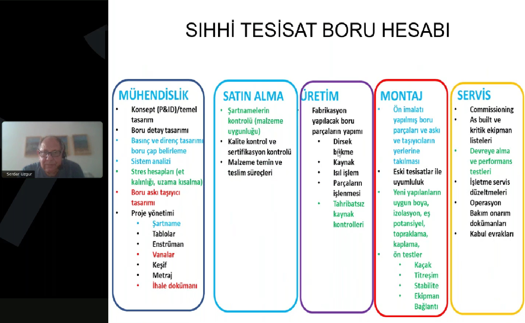 TTMD Akademi’nin çevrimiçi eğitimleri kapsamında organize edilen “Bina Tesisatı (Sıhhi Tesisat) Eğitimi” 15 – 30 Eylül 2025 tarihleri arasında ikinci kez gerçekleştirildi. Prof. Dr. Ahmet Arısoy, Sarven Çilingiroğlu ve Serdar Uzgur’un eğitmenliğini yürüttüğü ve toplam 13 kursiyerin katıldığı eğitimde, binalardaki temiz su ve pis su tesisatı dizaynı temel olarak anlatıldı.
