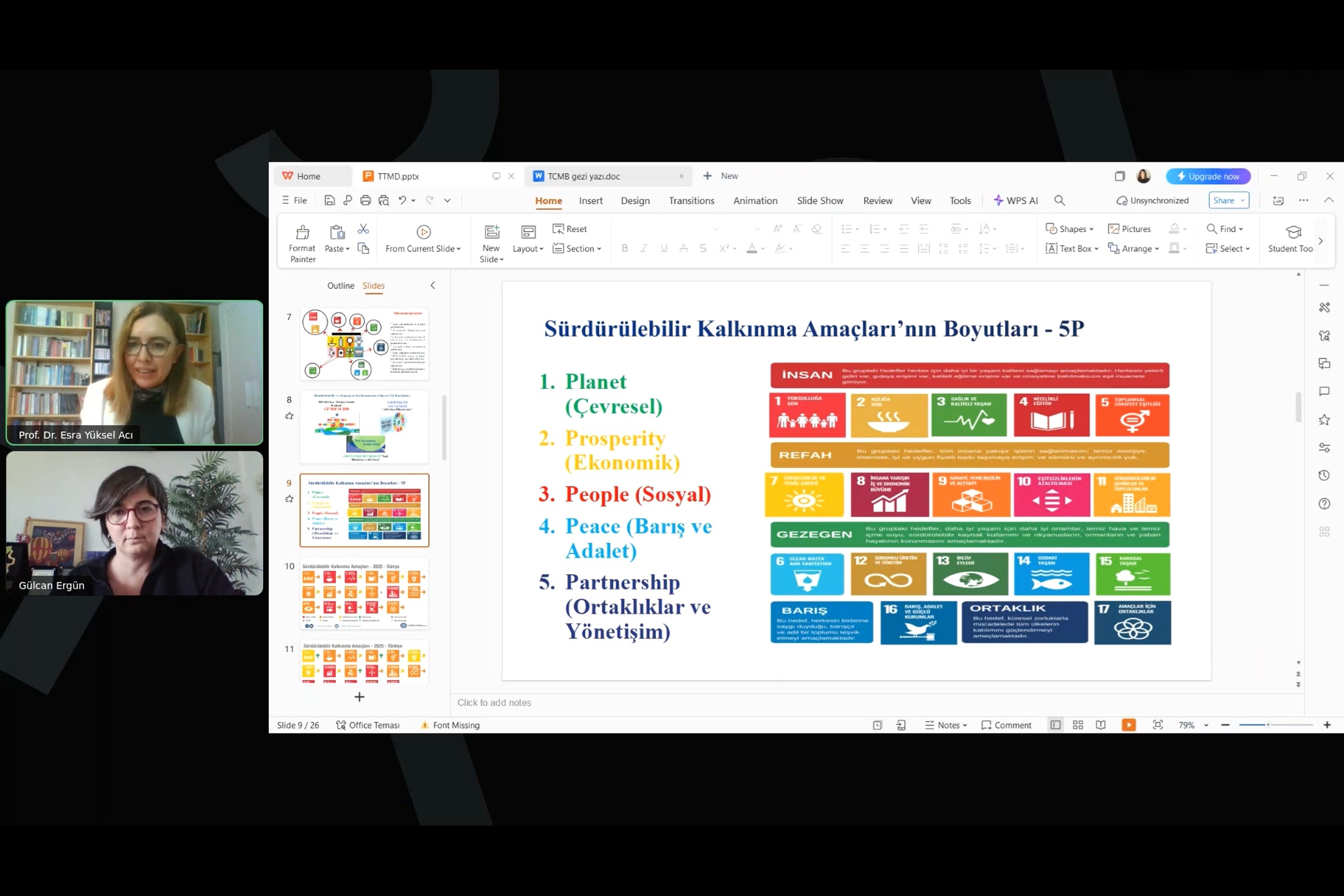 1945-1970 yılları arasında süregelen “Her şeye rağmen kalkınma anlayışı” ve bu sürecin beraberinde getirdiklerinden söz ederek sözlerine başlayan Prof. Dr. Esra Yüksel Acı, yeni kalkınma paradigmaları, sürdürülebilir ve kapsayıcı kalkınma anlayışı ile birlikte SKA' Türkiye ve Dünya çerçevesinden değindi. SKA’ların iş faaliyetlerine entegre edilmesi üzerine konuşan Acı, küresel ısınma ve beraberindeki iklim krizinin getirdiği eşitsizlikler ve bu eşitsizliklerin ortadan kaldırılması için kamu-özel ve sivil toplumun üzerindeki rolleri anlattı. Sürdürülebilirliğin kurumlar için gerekliliğine dikkat çeken konuşmacı, sürdürülebilir ve kapsayıcı kalkınmanın güncel yol haritasına dair bilgiler aktardı.