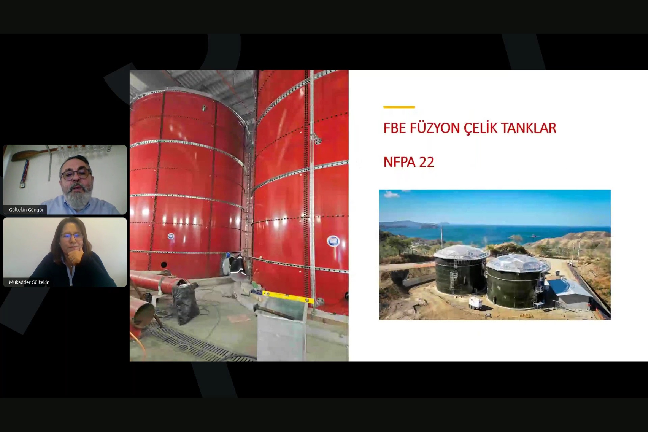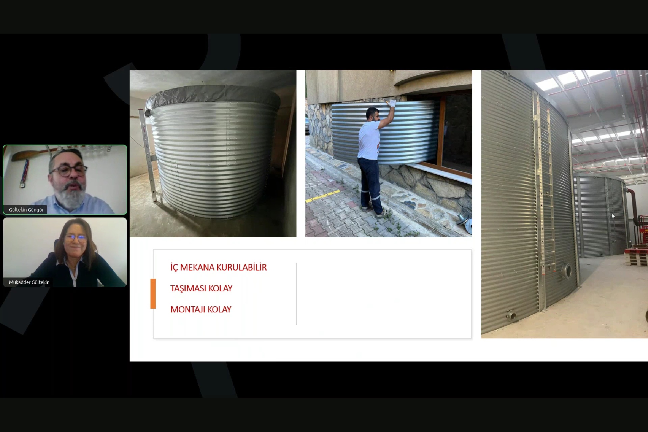 Sunumuna prizmatik grp ve çelik su depolarındaki yapısal sorunları sıralayarak başlayan Gültekin Güngör, şebeke suyundaki yüksek klorun depo içinde oksijen ile birleşerek klorgazı oluşturduğuna ve bunun paslanma sorununa yol açtığına dikkat çektikten sonra mikrobiyal paslanma, galvanik ve gerilim korozyonuna değindi. Su depolarında yaşanan patlama kaynaklı kazalara ilişkin örnekler sunan Güngör daha sonra silindirik modüler su deposu hesabı ve dizaynı, malzeme çeşitleri ve farklı tipte yapılan su depoları hakkında detaylı bilgiler paylaştı. Konuşmacı ayrıca birbirinden farklı su deposu tiplerinin avantaj ve dezavantajlarını aktardı. Katılımcıların yoğun ilgi gösterdi soru cevap bölümünün ardından seminer sona erdi.