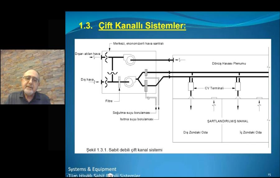 Toplam 5 hafta ve 45 saat süren kurs kapsamında; kanal tasarımı, fanlar, oda hava dağıtım ekipmanları, klima santrali, ısı geri kazanımı, kompresörler, ısıtma ekipmanları ve bileşenleri, HVAC sistem seçimi, tam havalı sistemler, tam sulu sistemler, ısı pompaları, VRF ve soğuk tavan sistemleri gibi konu başlıklarında detaylı bilgiler anlatıldı.