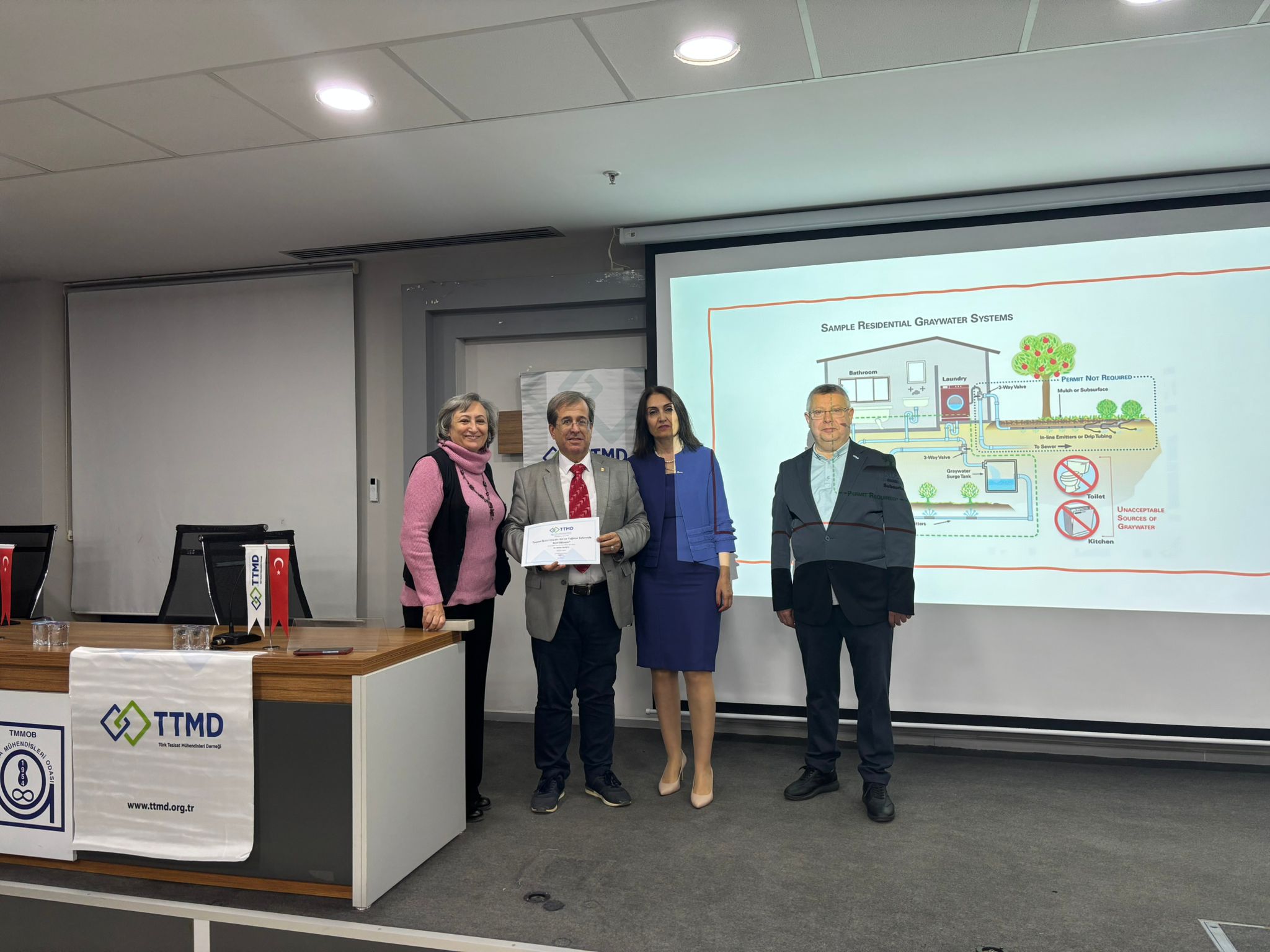 Sunumun ikinci bölümünde gri suyun tanımı, arıtılmış gri su kullanım alanları, gri su miktarı ve bileşenleri, sistem tasarımı yapılırken kabuller, MBR sistemi avantajları gibi başlıklarda bilgiler veren konuşmacı, gri su sistemi kapasitesine karar verilme adımlarını anlattı. Bursa ve çevre illerden çok sayıda dinleyicinin katıldığı seminer, soru-cevap bölümünün ardından TTMD Bursa İl Temsilcisi Hüseyin Uludaş’ın oturum başkanı ve konuşmacıya teşekkür belgesi takdimiyle tamamlandı.