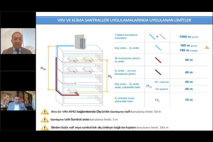 İkinci konuşmacı Kemal Özlü, iklimlendirmede mekanik ekipmanlar ve ısıl verimde yeni yaklaşımlar başlığı altında sürdürülebilir yeni bakış açılarına değinerek sunumuna başladıktan sonra, klima santrallerinin geleneksel yöntem ve VRV sistem ile entegre kullanımını anlattı. Klima santral kiti, VRV ve klima santrallerinin kontrol ve bağlantı senaryoları hakkında bilgiler veren Özlü, VRV ve klima santralinde uygulanan limitleri paylaştıktan sonra VRV uygulamalar ile sağlanan faydaları örnekledi.