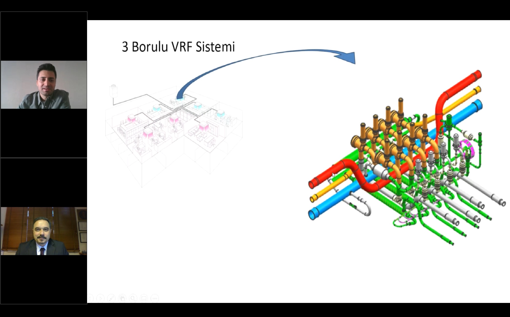 Sunumuna VRF’nin (Değişken Soğutucu Debili Akışkan) çoklu iç üniteyi, bir dış ünite grubu ile bağladığını ve farklı bölgelerde kişiselleştirilmiş iklimlendirme sağladığını söyleyerek başlayan Burak Akyaka, P-h diagramı üzerinde anlatım yaptıktan sonra soğutma çevriminin kompresör, kondanser, genleşme vanası aşamalarını aktardı. 2 ve 3 borulu VRF sistemleri hakkında bilgiler veren Akyaka daha sonra VRF sistemlerinde yaygın görülen uygulama hatalarına değindi. Yanlış uygulanmış, dış ve iç ünite konumları ile borulama hatalarından örnekler sunan konuşmacı, su soğutmalı VRF’ler de su sıcaklığının dalgalanması, VRF minimum kullanım kapasitesi, nominal ve maksimum çekilen güç, gaz miktarının ayarlanması gibi konuları anlattı. Katılımcıların yoğun ilgi gösterdiği soru-cevap bölümünün ardından seminer sona erdi.