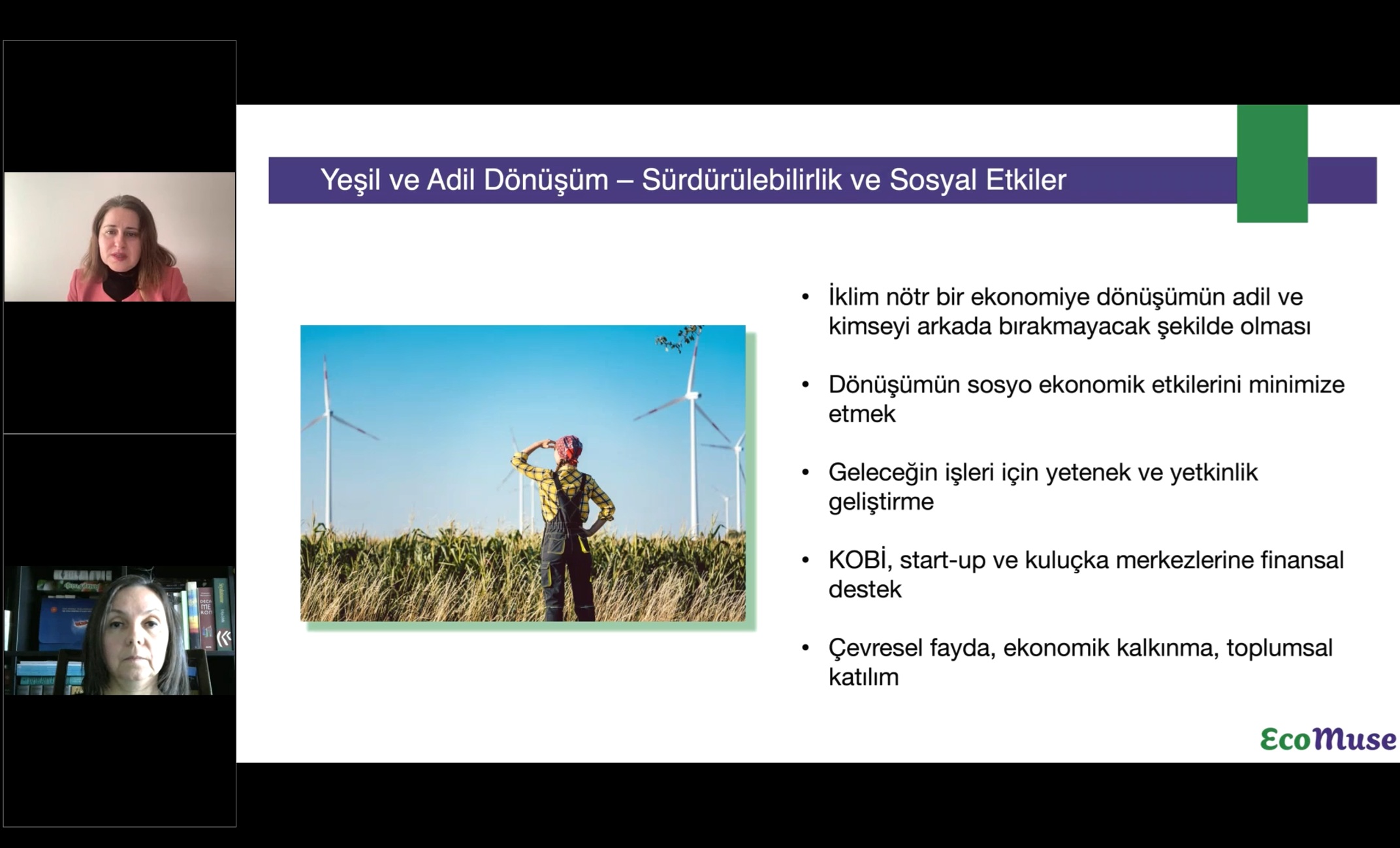 Türkiye’nin yeşil dönüşümünü hızlandırmak için yapılması gerekenleri “Gelişen temiz teknolojileri, iş modellerini, finansal modelleri yakından takip etmek. Şeffaf, esnek, entegre, sürekli değişmeyen, yeşil yatırım yapmak isteyenlerin önünü açacak, yabancı yatırımcıyı kaçırmayacak mevzuatlar oluşturmak. Şirketlerin, orta ve uzun vadeli yeşil dönüşüm planlaması yapması, yeşil yatırım proje portföylerini oluşturması, projeleri önceliklendirmesi” şeklinde sıralayan konuşmacı, yeşil dönüşümün temel finansman enstrümanlarını ise nakit, kredi, finansal kiralama, yeşil tahvil, hisse satışı, hibe, ESCO, kitlesel fonlama ve karbon kredisi olarak aktardıktan sonra finansman programı örnekleri sundu. Selen İnal sunumunun son bölümünde sürdürülebilirlik raporlamasının önemi ve bununla ilgili AB ve Türkiye’deki gelişmeleri, yeşil dönüşümdeki riskleri ve fırsatları anlattı.